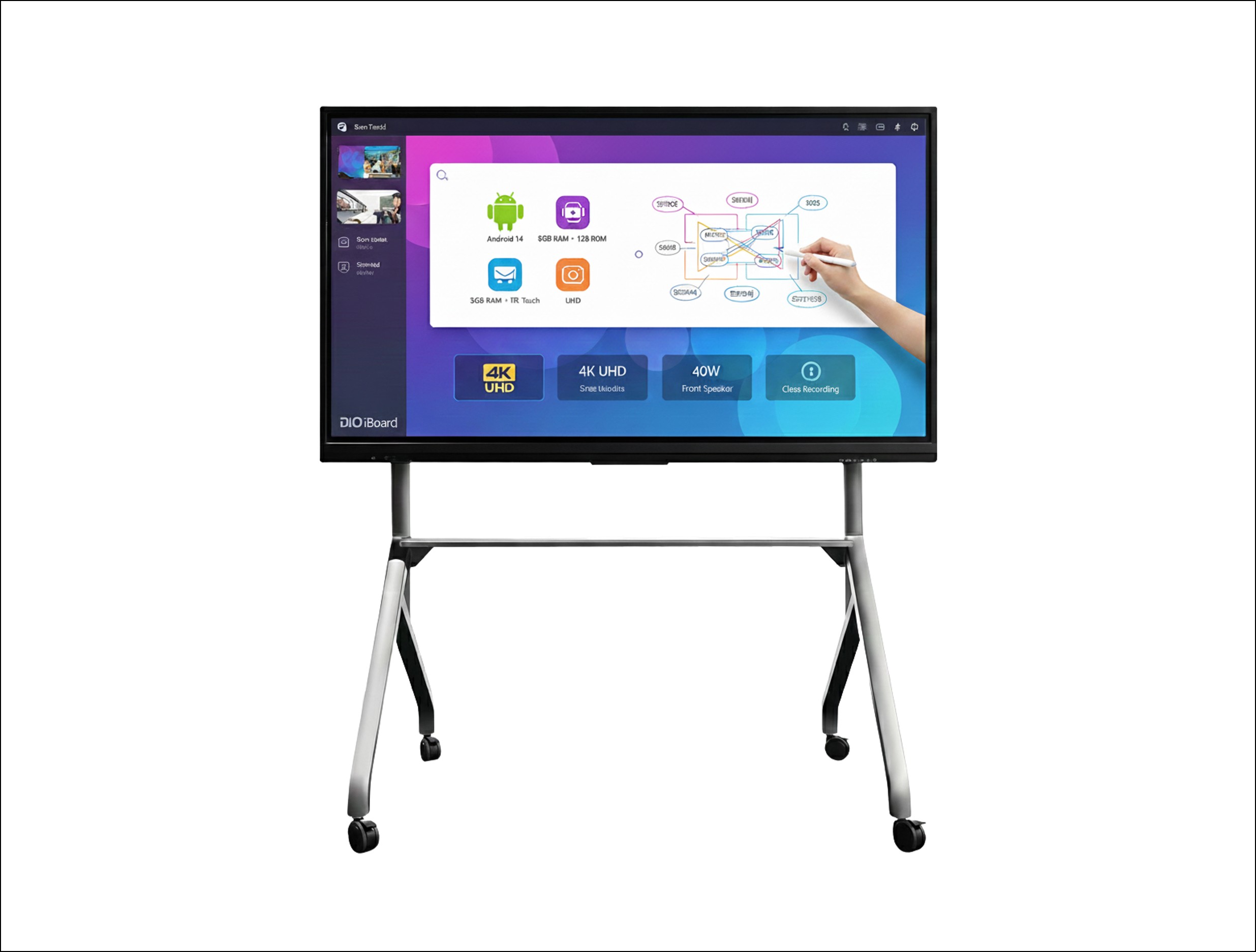 사양3840 X 2160 (UHD) / 발기,명암비: 400 cd/㎡ 1200 : 1 / 스피커: 40W / 터치센서: 최신 3mm IR 터치기술 / 강화유리 / 간편버튼: Power/Custom/Back/Home/Menu / Main Board: Octa core 8G+128G / GPU: Mali G52 / Android14 / 판서내용 녹화가능< 290W